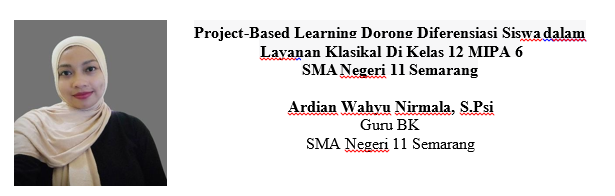 Project Based Learning atau PJBL adalah pendekatan pembelajaran yang melibatkan siswa dalam proyek-proyek nyata yang relevan dengan kehidupan sehari-hari atau bidang studi tertentu. Dalam konteks PJBL, siswa terlibat secara aktif dalam proyek-proyek autentik yang melibatkan eksplorasi, refleksi, dan pembelajaran kolaboratif. Melalui pengalaman langsung ini, siswa dapat membangun pengetahuan, keterampilan, dan pemahaman yang lebih baik dalam konteks pengembangan pribadi dan karir. Teori konstruktivisme mendukung penerapan PJBL dalam layanan BK karena memberikan kesempatan bagi siswa untuk mengkonstruksi pemahaman mereka sendiri tentang diri mereka dan tujuan hidup mereka (Jonassen, D. H.,1999). Dalam konteks Bimbingan dan Konseling (BK), PJBL dapat menjadi alat efektif untuk menciptakan layanan klasikal yang mendukung diferensiasi siswa, hal ini telah dilaksanakan oleh penulis di kelas 12 MIPA 6 SMA Negeri 11 Semarang.